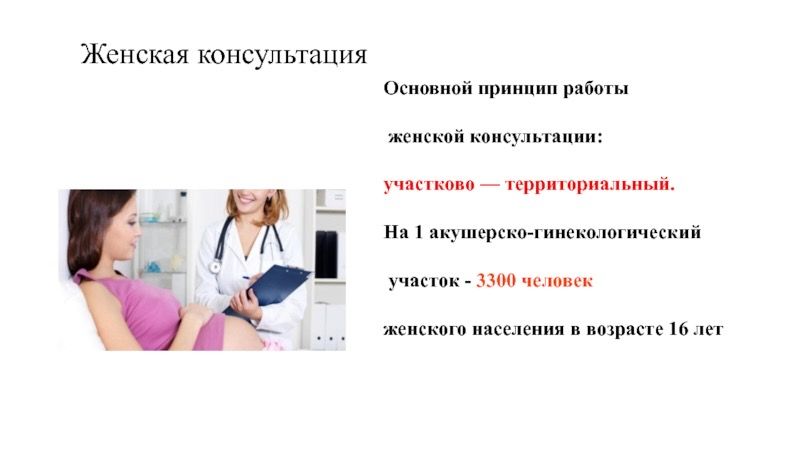 Участковый принцип позволяет акушеру-гинекологу осуществлять постоянную связь с участковым терапевтом амбулаторно-поликлинических учреждений, терапевтом Женской консультации и другими специалистами.